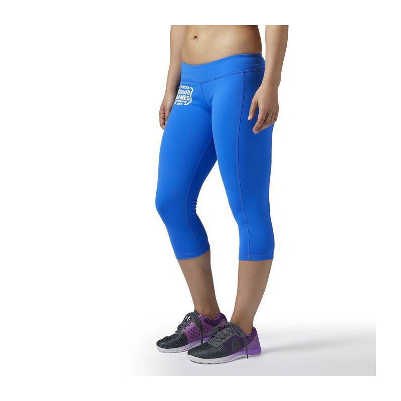 This classic silhouette is perfect for any WOD. Knit capri with nylon/elasthan fabrication. Speedwick moisture management technology. Antimicrobial guesset helps prevent odors. Power mesh inside waistband to support fit. Bonded side seam and hem, bonded waistband pocket. Inside hidden message. Reebok CrossFit Games Crest. Reebok CrossFit branding.